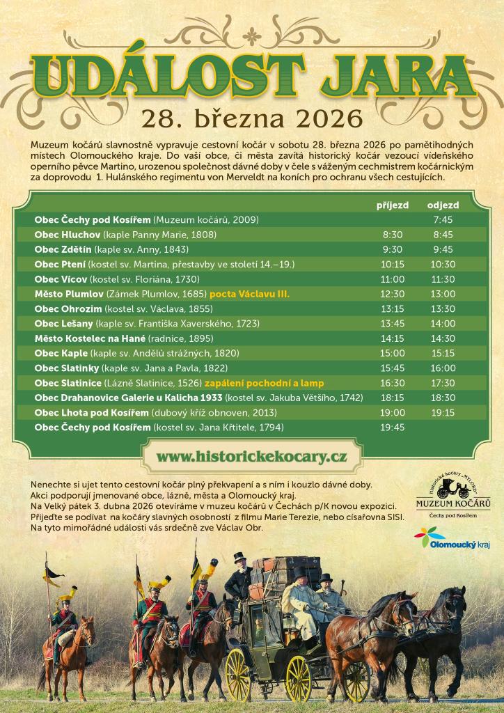 Muzeum kočárů připravuje v sobotu 28. března 2026 společně s obcemi pozoruhodnou akci. Slavnostně vypravujeme historický cestovní kočár jedoucí po pamětihodných místech Olomouckého kraje. Program je unikátní tím, že vše se děje jako ve starých dobách. Setkávají se generace na posvátných místech náměstí, kostelů, kaplí, zvonic či kapliček a přinášíme tím v programu kulturní i duchovní odkaz našich předků.